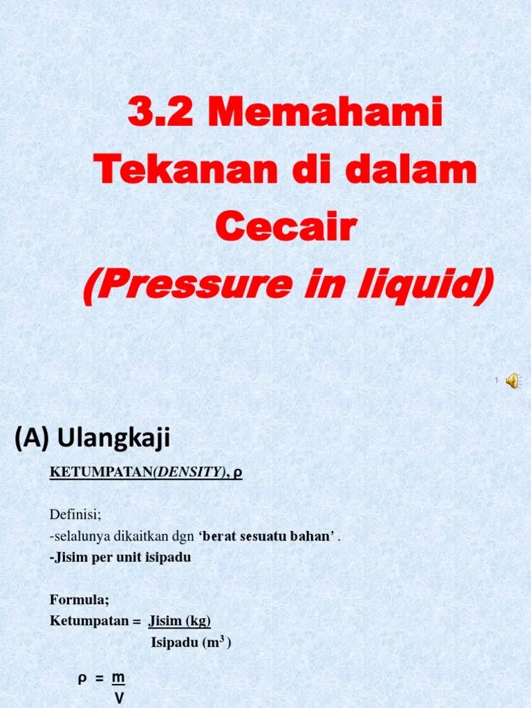 Menghubungkaitkan kedalaman, ketumpatan dengan tekanan dalam cecair; tekanan dalam cecair. Menghubungkaitkan kedalaman, ketumpatan dengan tekanan dalam cecair;